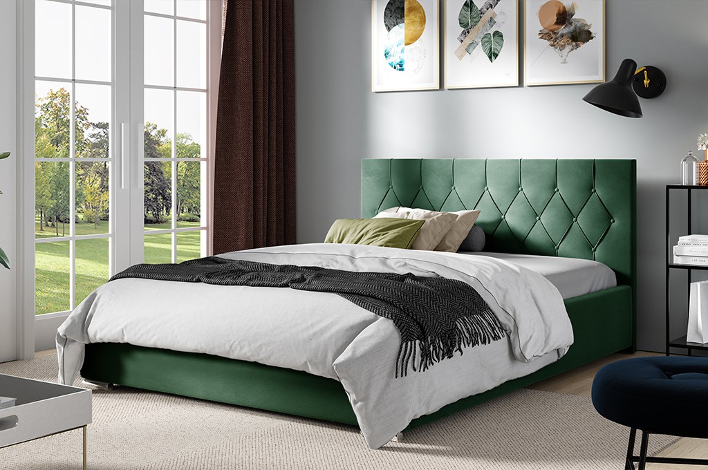 Tapicerowany korpus obity miękką welurową tkaniną prezentuje się elegancko i stworzy w Twojej sypialni ciepłą i przytulną atmosferę.