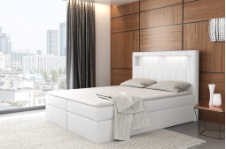 Łóżko wyposażono w wysokie wezgłowie o wysokości 123cm, które posiada pionowe przeszycia na powierzchni, a także praktyczne oświetlenie LED.