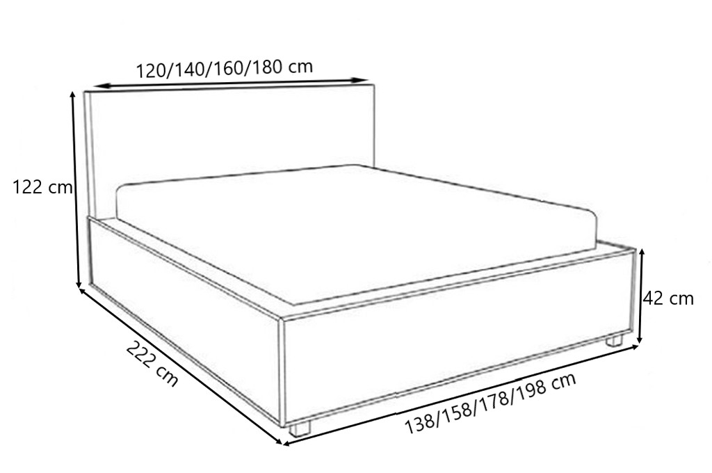140 - szerokość: 158 cm, wysokość powierzchni spania:42 cm, długość: 222 cm, powierzchnia spania: 140 x 200 cm,