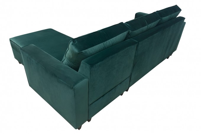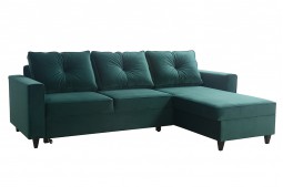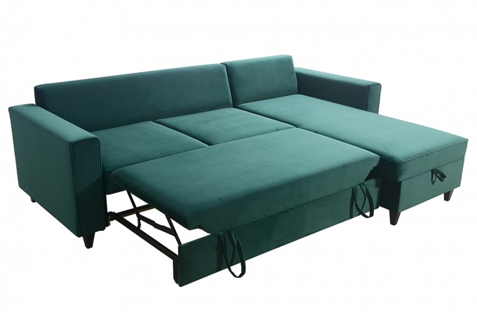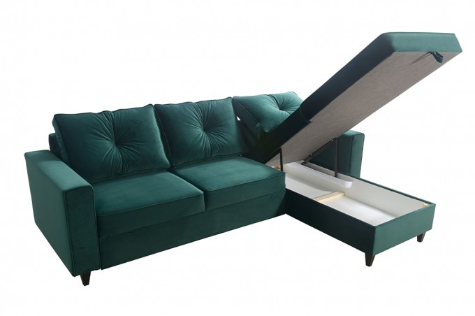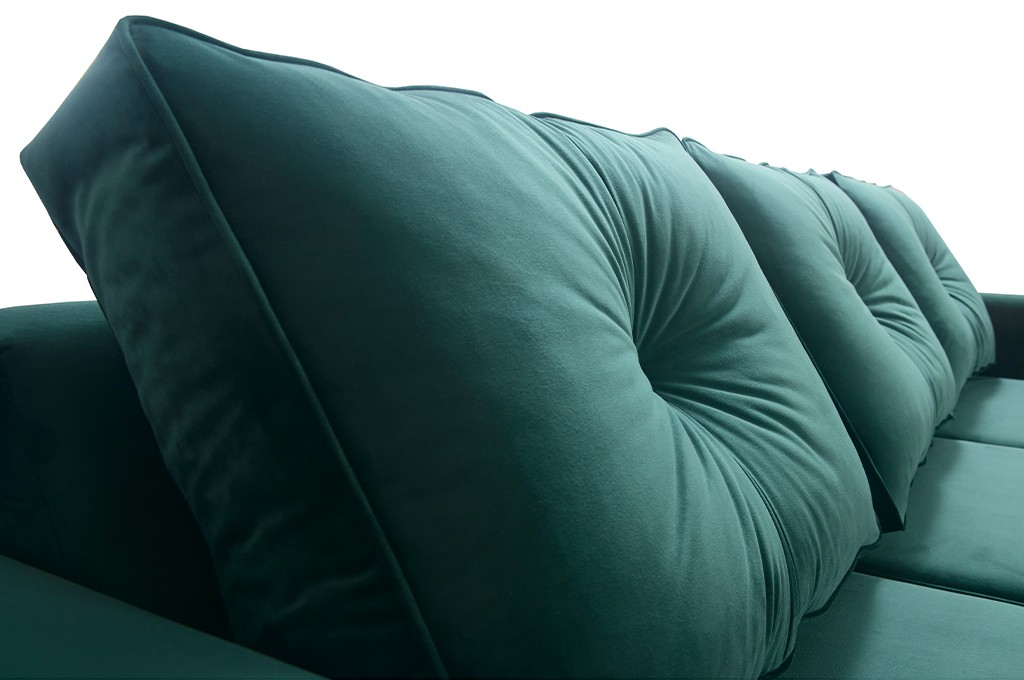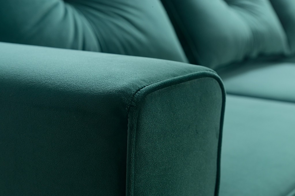 Jeśli kochasz styl skandynawski to narożni z serii AMIRA został stworzony dla Ciebie. Prostota wykonania oraz minimalizm połączony z kolorem butelkowej zieleni to dopełnienie każdego pokoju czy salonu. Cechą wyróżniającą kolekcję są wysokie nóżki wykonane drewna.
