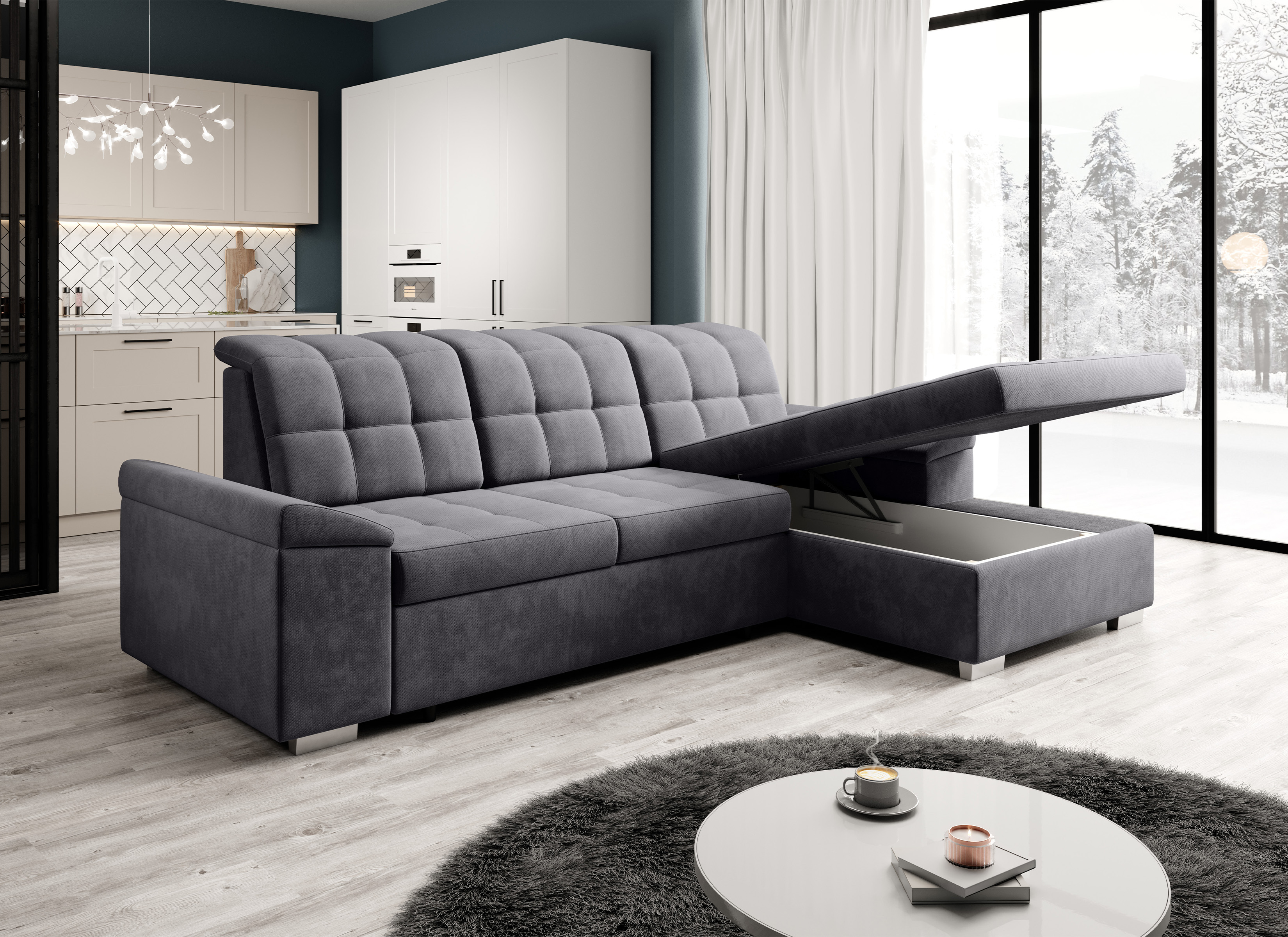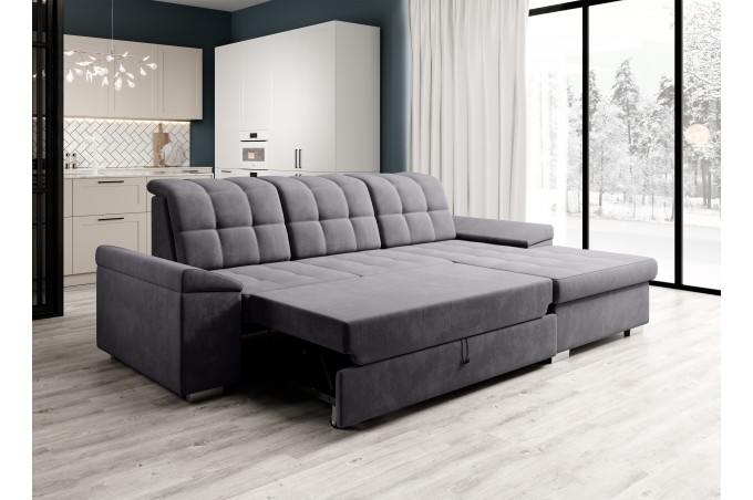 Rogówka wypoczynkowa ze sprężynowym siedziskiem OLIVIER z pojemnikiem na pościel i regulowanymi zagłówkami