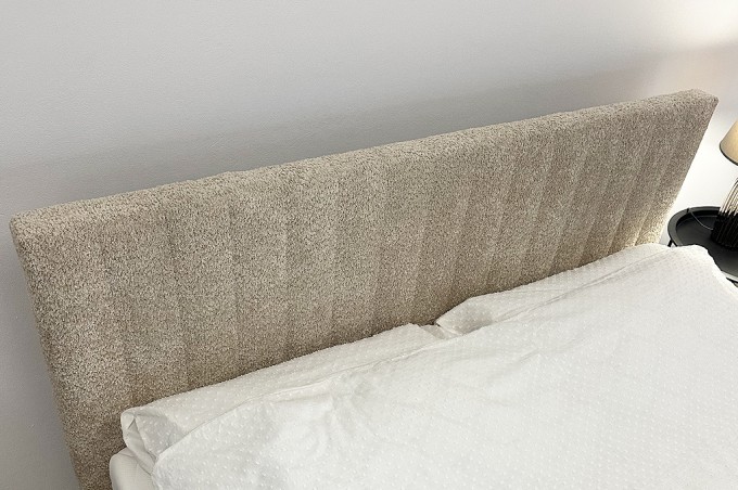 ISARA SLIM to zachwycające łóżko tapicerowane ozdobione ozdobione pionowymi przeszyciami, które pięknie uwypuklają elementy. Przeszycia znajdują się zarówno na wezgłowiu jak i dolnej ramie łóżka.