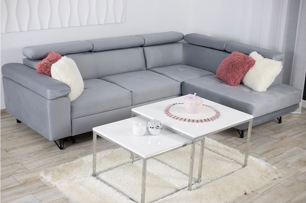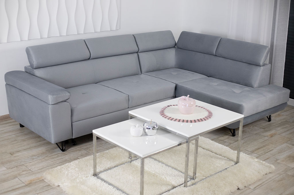 Charakterystyczną cechą narożnika są regulowane zagłówki ustawiane według preferencji użytkownika. Wygodne wypełnienie siedziska sprężyną falistą oraz gęstą pianką T30 zapewni Ci komfort.