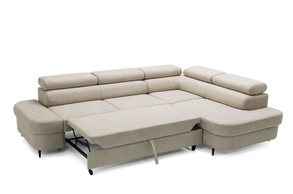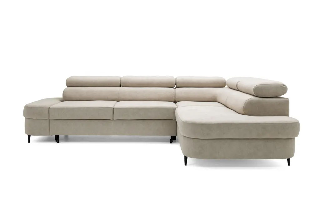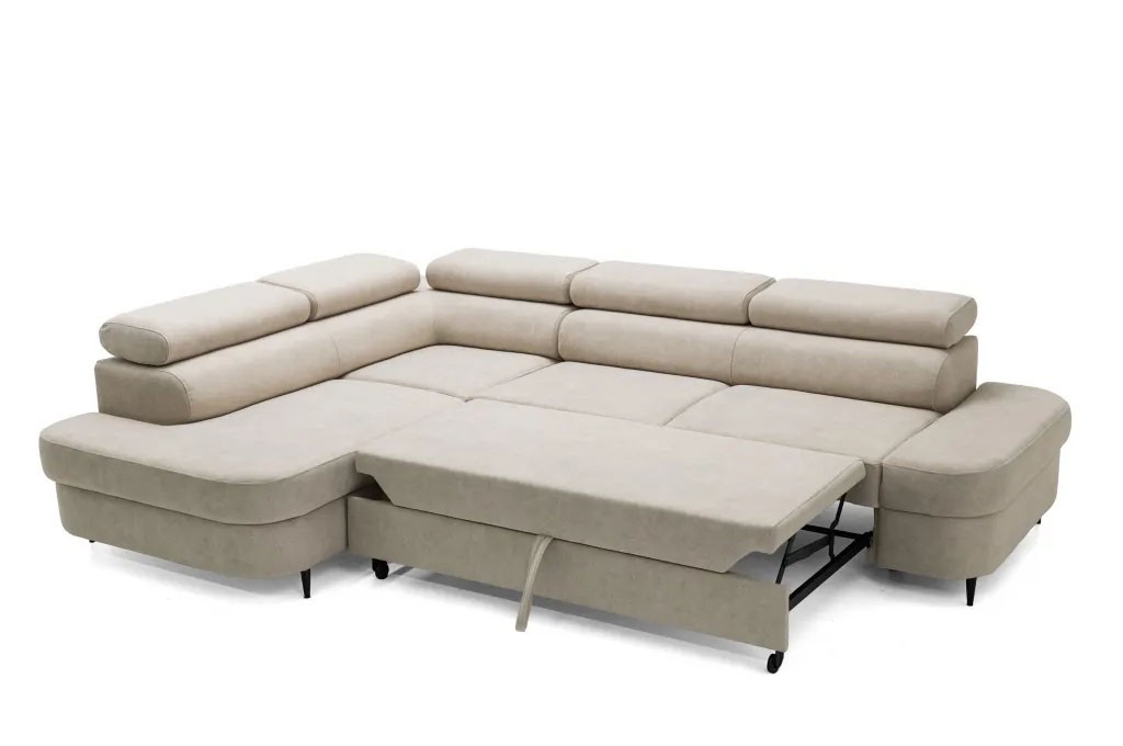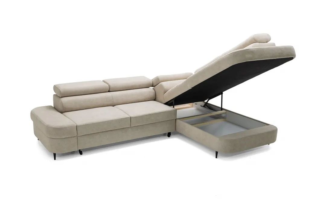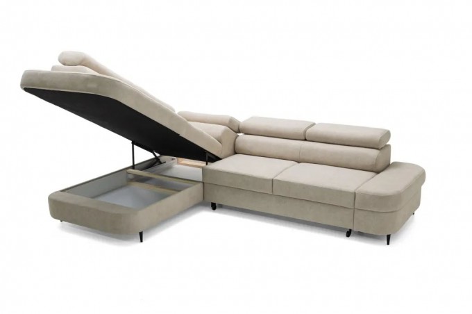 Nowoczesny narożnik wypoczynkowy typu L z funkcją spania, regulowanymi zagłówkami i pojemnikiem na pościel CARLOS