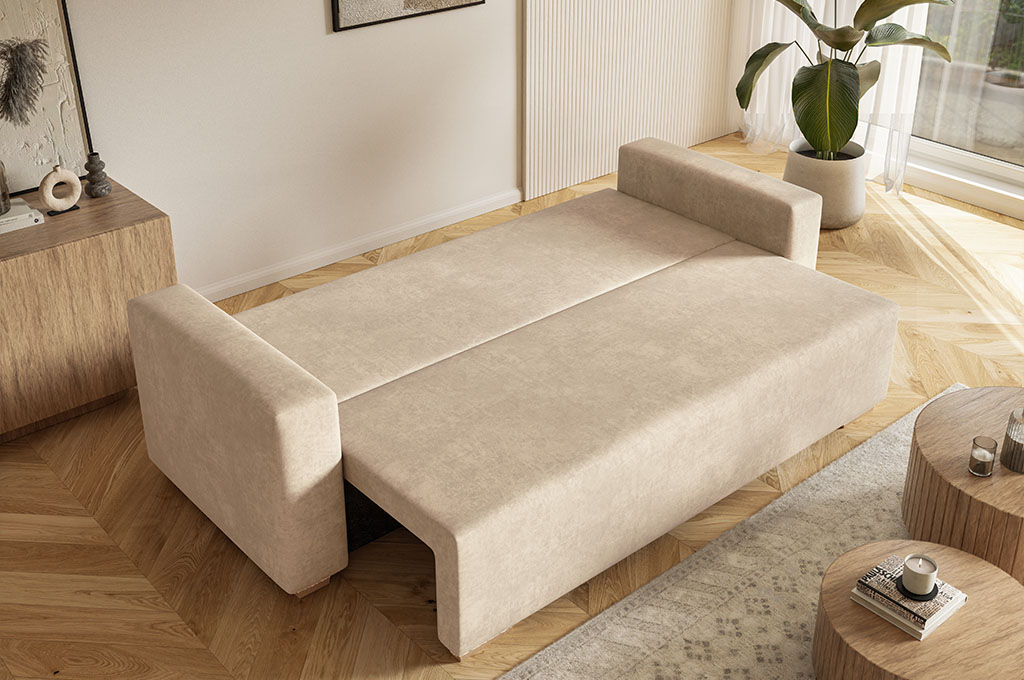 Kanapa posiada mocny stelaż wykonany z drewna, dzięki czemu gwarantuje stabilność i trwałość całej konstrukcji oraz pojemnik na pościel.
