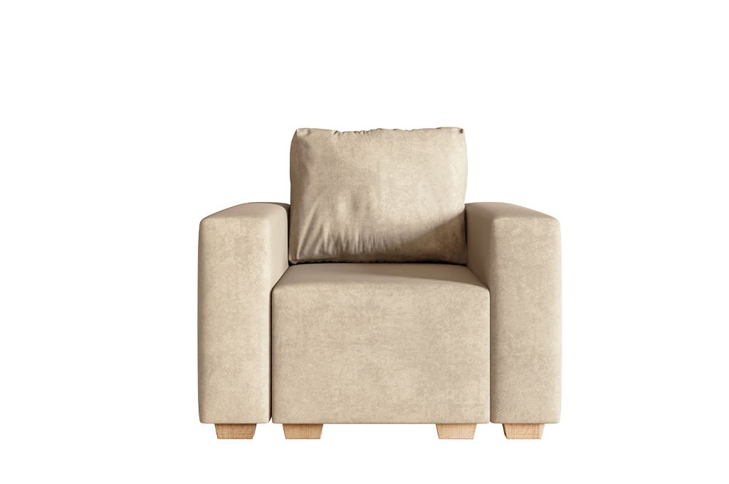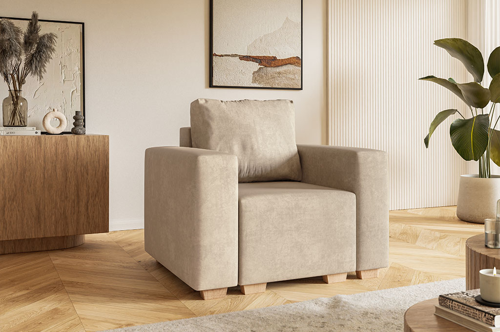Fotel posiada mocny stelaż wykonany z drewna, dzięki czemu gwarantuje stabilność i trwałość całej konstrukcji.
