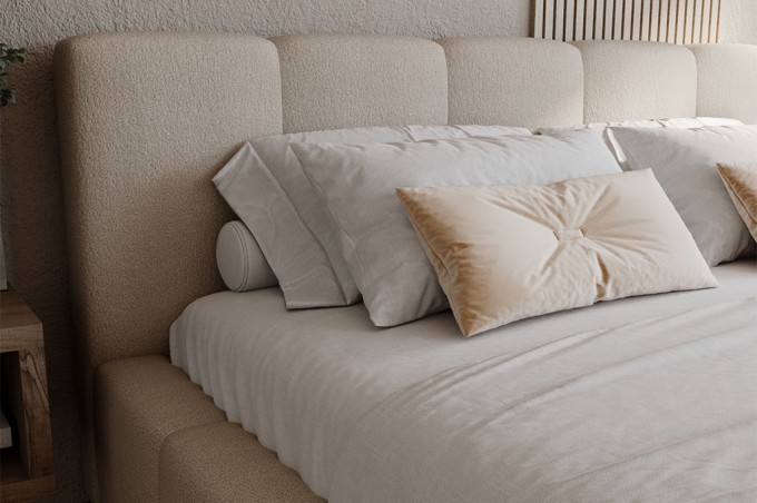 Wezgłowie łóżka FADO zachwyca swoją pulchną i miękką formą, która dodaje całości przytulności i elegancji. Wyjątkowe przeszycia stanowią piękną ozdobę, nadając łóżku niepowtarzalny charakter. Dzięki wysokości 95 cm wezgłowie staje się idealnym oparciem podczas wieczornego czytania książki czy porannej kawy w łóżku.