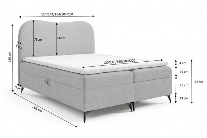 • Szerokość całkowita: 124/144/164/184/204 cm - zależna od wybranego rozmiaru powierzchni spania
