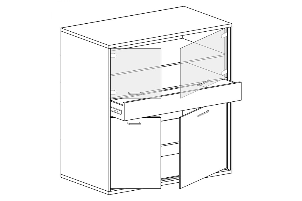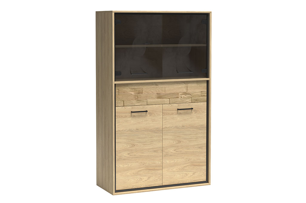 Górna część mebla wyposażona jest w podwójne fronty z przydymionego, hartowanego szkła oraz półkę z płyty laminowanej, która pozwalaja na estetyczne przechowywanie i prezentację ulubionych przedmiotów. Dolna szafka posiada jasne fronty z czarnymi, metalowymi uchwytami, za którymi ukryta jest praktyczna półka. Pomiędzy nimi znajduje się pojemna szuflada otwierana na dotyk – dzięki nowoczesnemu systemowi push to open codzienne użytkowanie staje się wyjątkowo wygodne.
