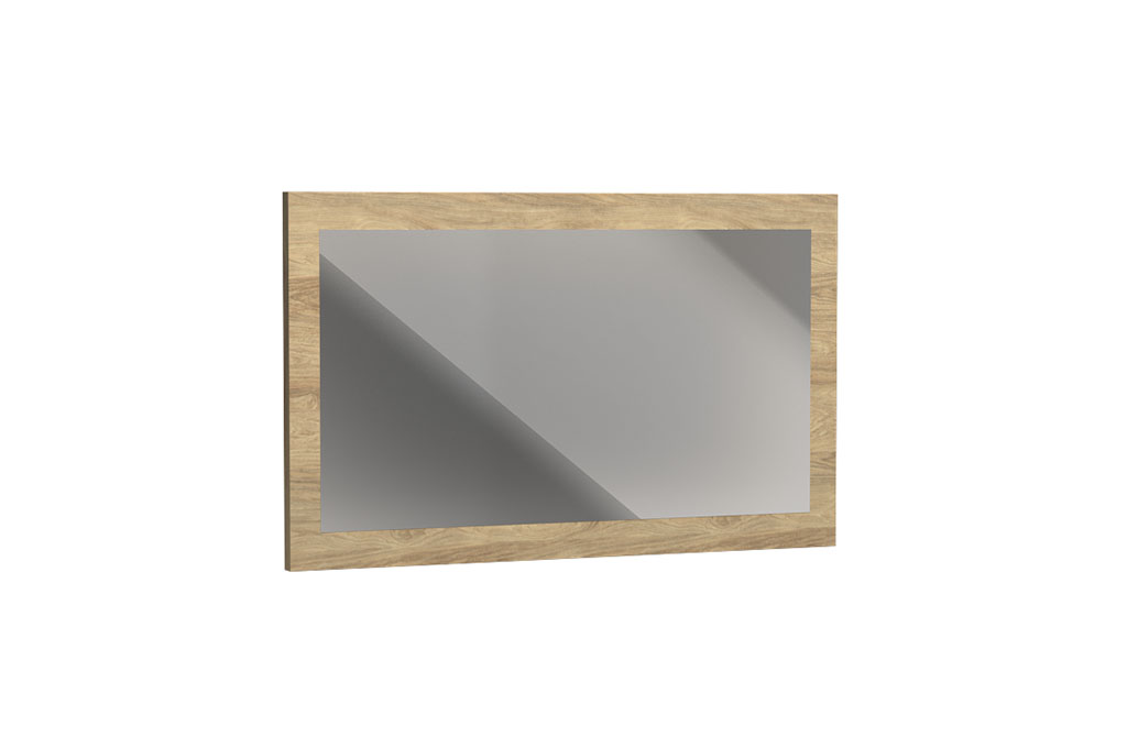 Lustro zostało umieszone na płycie koloru natural hikora, która tworzy wokół niego dekoracyjną, jasną ramę. Można je zawiesić pionowo lub poziomo, dopasowując do układu wnętrza. Odbijając światło, powiększa optycznie przestrzeń i nadaje jej ciepły, przytulny klimat.