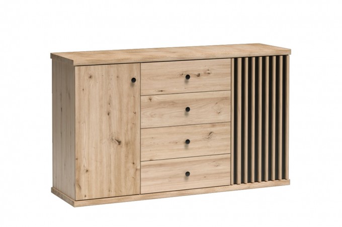 Przemyślany układ przechowywania obejmuje cztery pojemne szuflady oraz dwie obszerne szafki po bokach, co pozwala zachować porządek i mieć wszystko pod ręką. Mebel można podwyższyć dzięki zastosowaniu metalowych nóg o wysokości 10cm, dzięki czemu będzie prezentować się lekko i nowocześnie. Całość dopełniają delikatne czarne uchwyty, idealnie współgrające z naturalnym wybarwieniem Artisan.