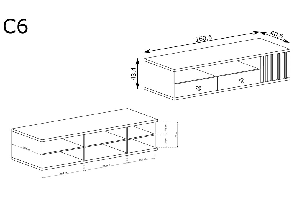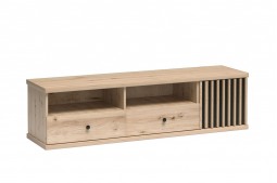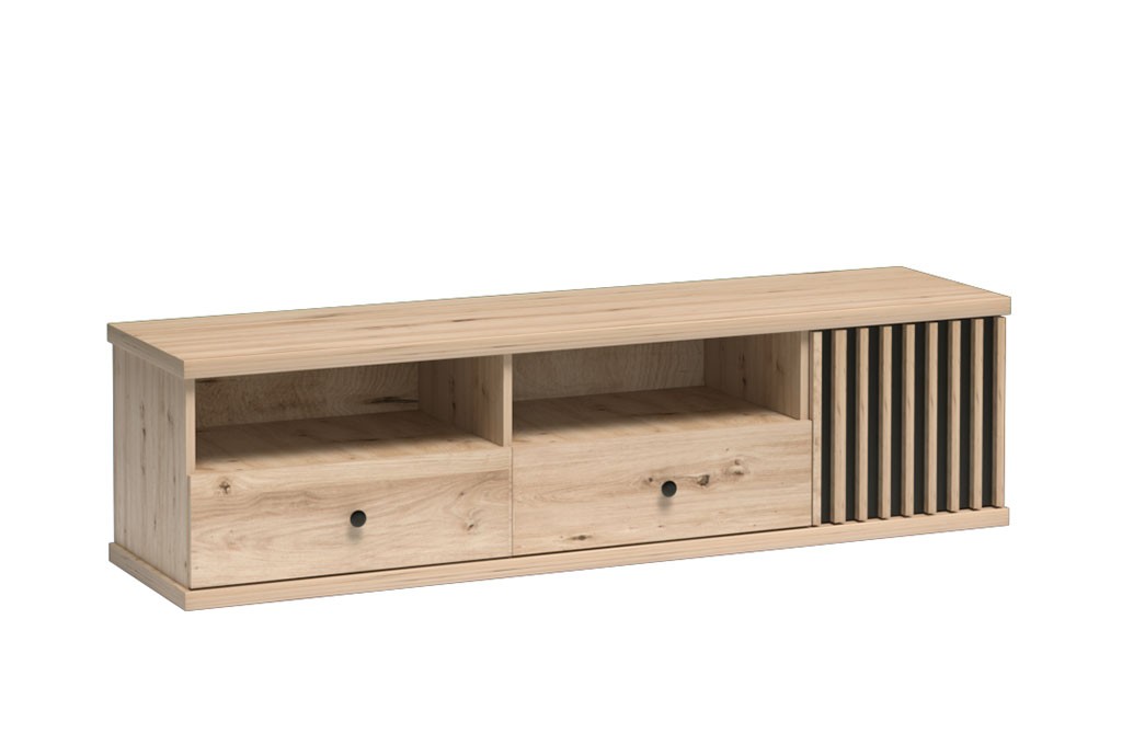 Nowoczesna szafka RTV o minimalistycznym designie z eleganckim, czarnym frontem ozdobionym lamelami. Korpus wykonany z trwałej płyty laminowanej w ciepłym odcieniu Artisan wprowadza do wnętrza przytulny klimat. Mebel oferuje dużo miejsca do przechowywania akcesoriów telewizyjnych i innych drobiazgów niezbędnych w salonie. Dwie pojemne szuflady z systemem cichego domyku gwarantują komfort użytkowania i porządek na co dzień.