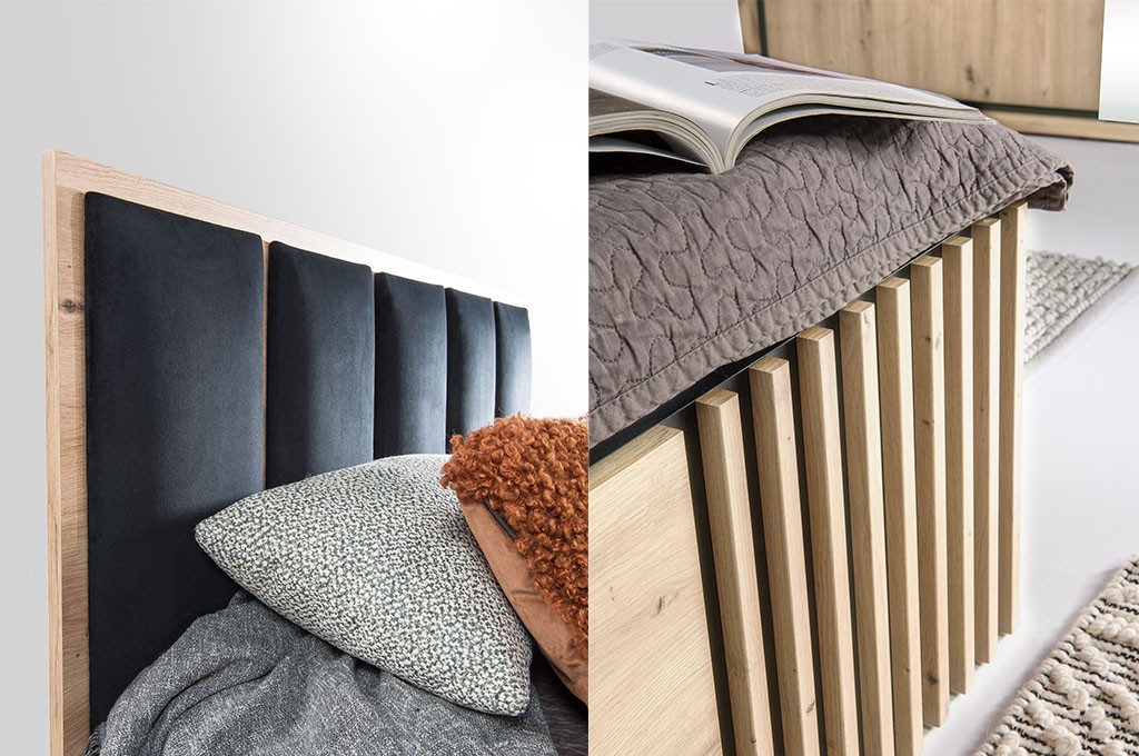 Łóżko z najnowszej kolekcji to model łączący nowoczesne wzornictwo z funkcjonalnymi rozwiązaniami. W części przedniej zastosowano dekoracyjne lamele, natomiast zagłowie wykończono czarnymi, tapicerowanymi płytami.