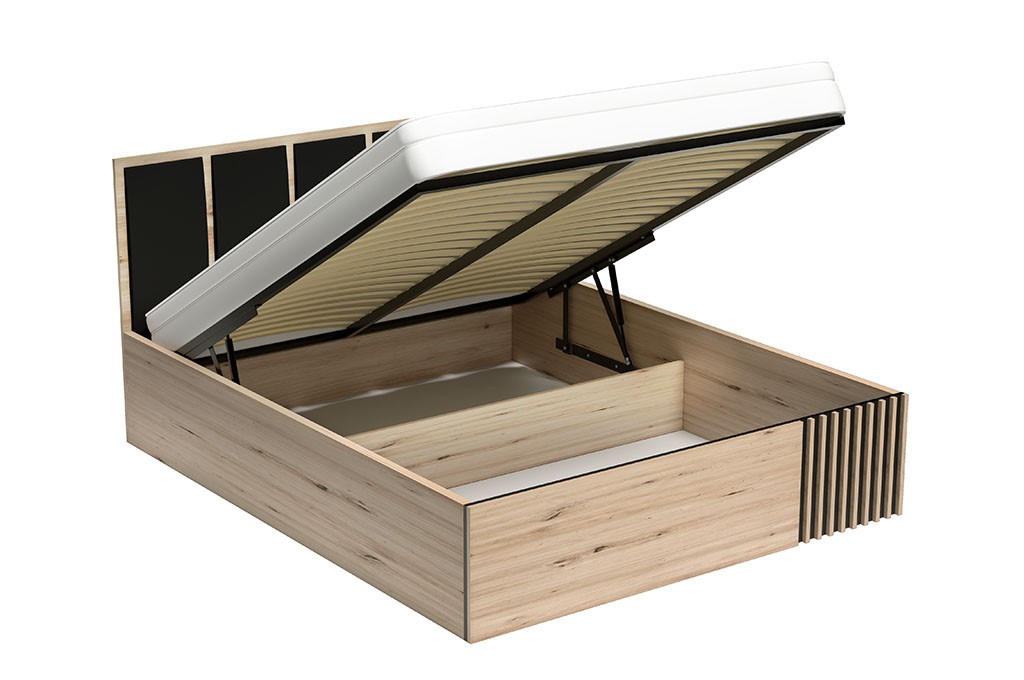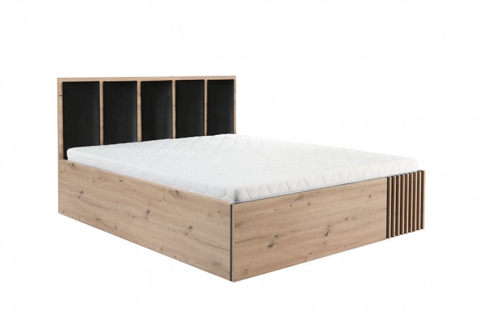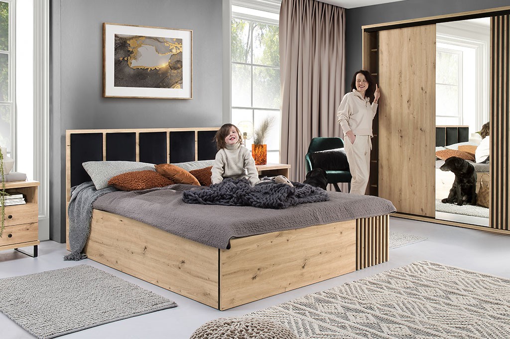 Łóżko z najnowszej kolekcji to model łączący nowoczesne wzornictwo z funkcjonalnymi rozwiązaniami. W części przedniej zastosowano dekoracyjne lamele, natomiast zagłowie wykończono czarnymi, tapicerowanymi płytami.