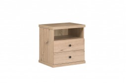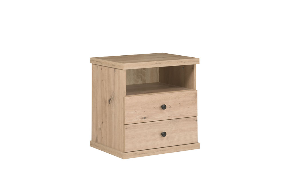 Stolik nocny z kolekcji Cali to praktyczny mebel przeznaczony do sypialni. Wyposażony jest w dwie szuflady oraz otwartą półkę, które umożliwiają wygodne przechowywanie najpotrzebniejszych przedmiotów.