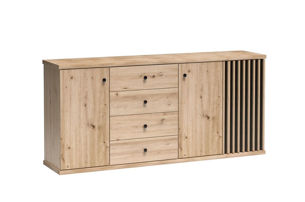 Przemyślany układ przechowywania obejmuje cztery pojemne szuflady oraz trzy obszerne szafki po bokach, co pozwala zachować porządek i mieć wszystko pod ręką. Mebel można podwyższyć dzięki zastosowaniu metalowych nóg o wysokości 10cm, dzięki czemu będzie prezentować się lekko i nowocześnie. Całość dopełniają delikatne czarne uchwyty, idealnie współgrające z naturalnym wybarwieniem Artisan.