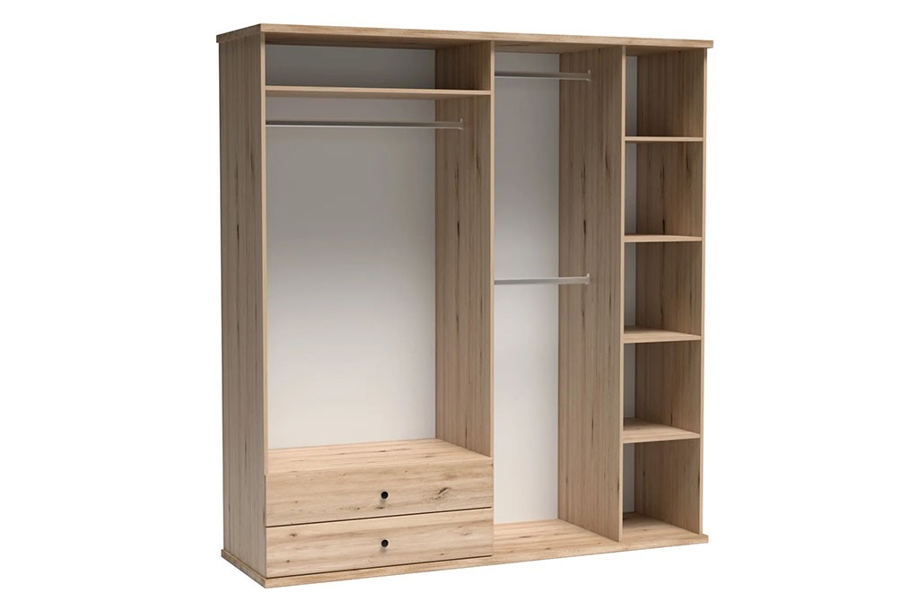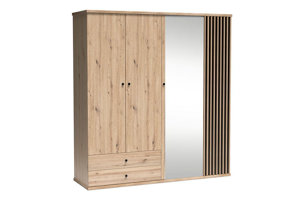 Szafa z kolekcji Cali to funkcjonalny i estetyczny mebel wykonany w naturalnym odcieniu Artisan, uzupełnionym czarnymi elementami wykończenia. Front wyposażono w duże lustro, które optycznie powiększa przestrzeń oraz dekoracyjną wstawkę lameli podkreślającą charakter mebla.
