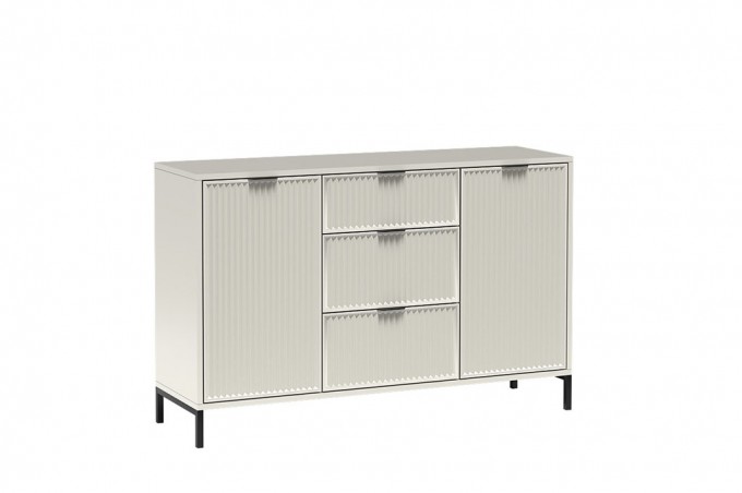 Nowoczesna komoda zaprojektowana z myślą o maksymalnej wygodzie i estetyce. Centralnie rozmieszczone 3 pojemne szuflady oraz dwie boczne szafki z praktyczną półką tworzą idealną przestrzeń do przechowywania ubrań, akcesoriów i dokumentów. Mebel oferuje wyjątkowy komfort codziennego korzystania, a jego dopracowana forma natychmiast przyciąga uwagę. Dostępna w trzech efektownych kolorach: cashmere, indigo i green stone.