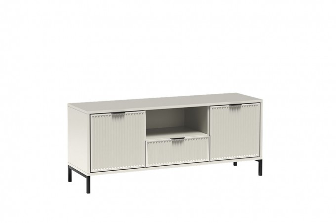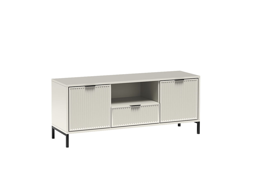 Nowoczesna szafka RTV idealnie sprawdzi się w mniejszych salonach, oferując przemyślaną i funkcjonalną przestrzeń do przechowywania. W centralnej części umieszczono głęboką szufladę na różnego rodzaju drobiazgi, a tuż nad nią praktyczną półkę przeznaczoną na dekoder lub konsolę. Po bokach znajdują się dwie zamykane szafki, w których z łatwością zmieścimy dodatkowe akcesoria. Stylowe, designerskie wykończenie sprawia, że mebel przyciąga wzrok i podkreśla charakter wnętrza. Szafka dostępna jest w trzech kolorach: cashmere, indigo oraz green stone.