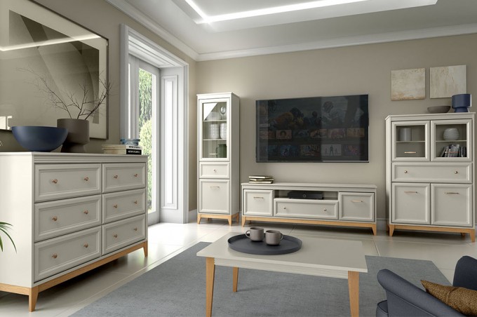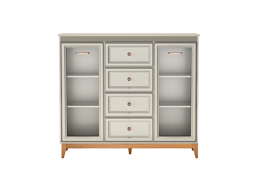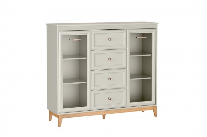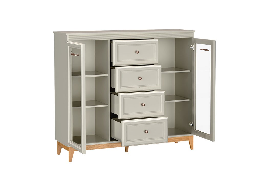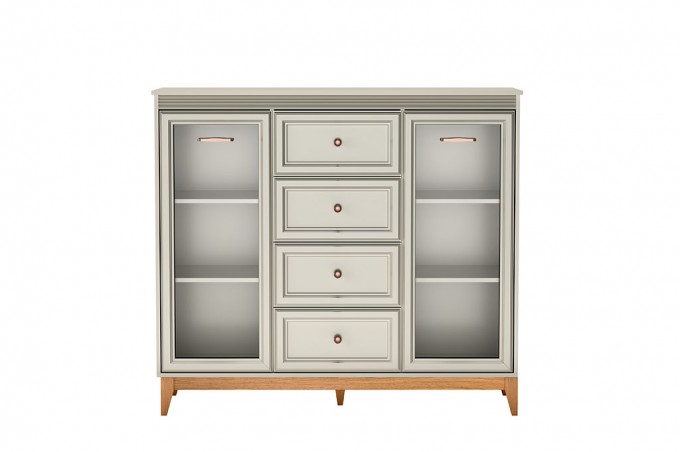 Windsor-7 to stylowa i wszechstronna witryna, która perfekcyjnie łączy tradycyjną estetykę z praktycznymi, współczesnymi rozwiązaniami. Jej delikatny kolor kaszmiru, podkreślony naturalnymi, drewnianymi akcentami, wprowadza do wnętrza ciepło i wyjątkową harmonię. Przemyślany układ oraz solidne wykonanie sprawiają, że model ten świetnie odnajdzie się w salonie, jadalni czy eleganckim gabinecie, pełniąc jednocześnie rolę efektownej dekoracji i funkcjonalnego miejsca do przechowywania.