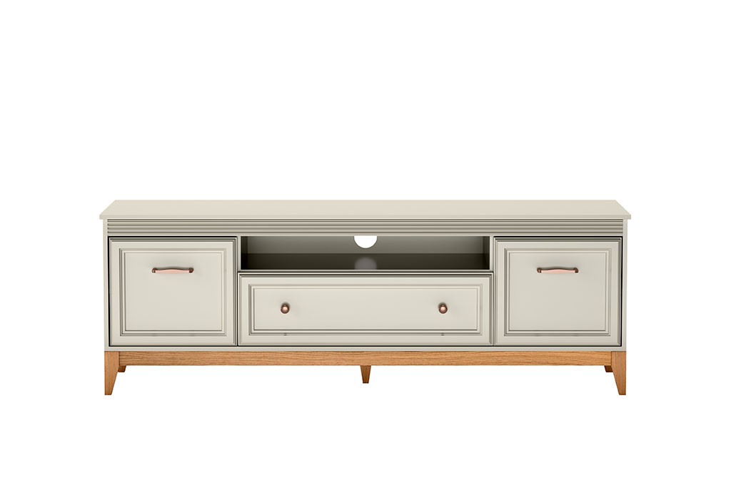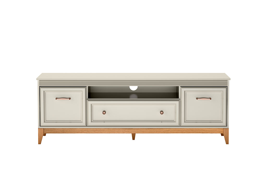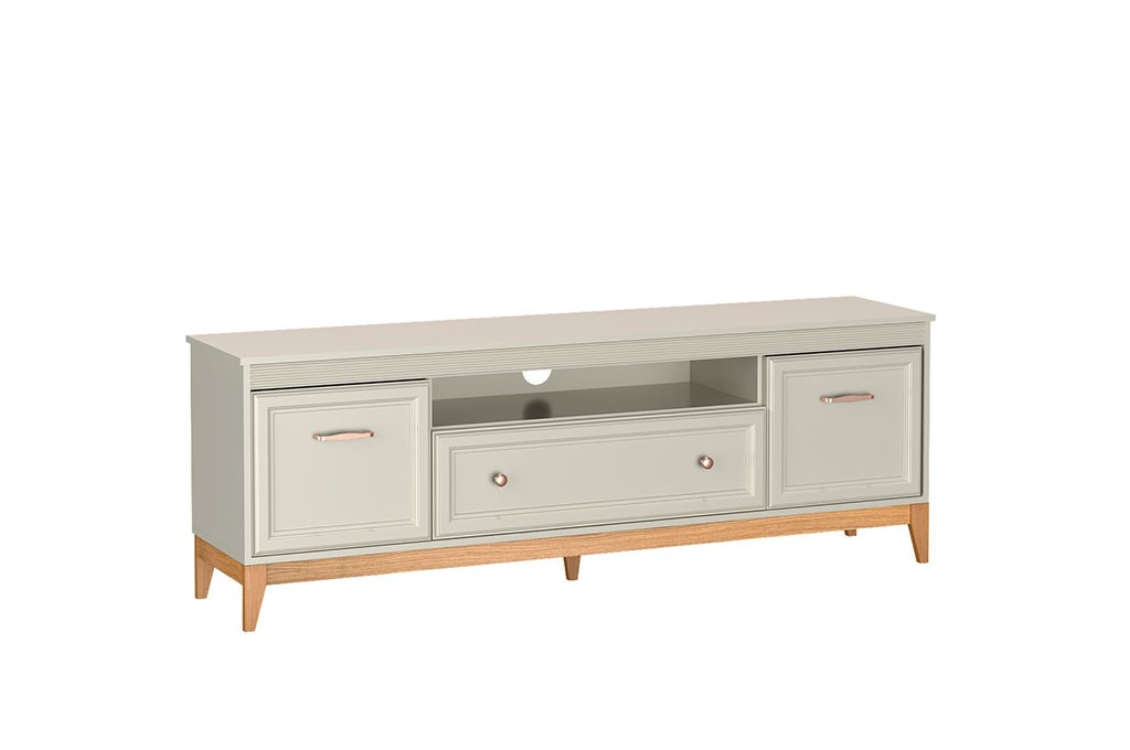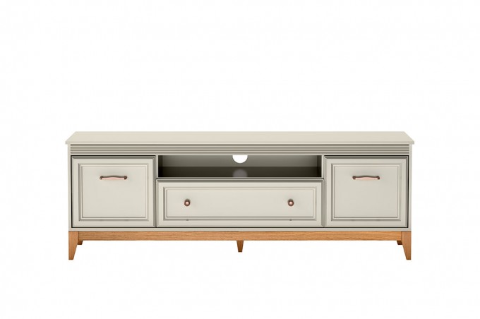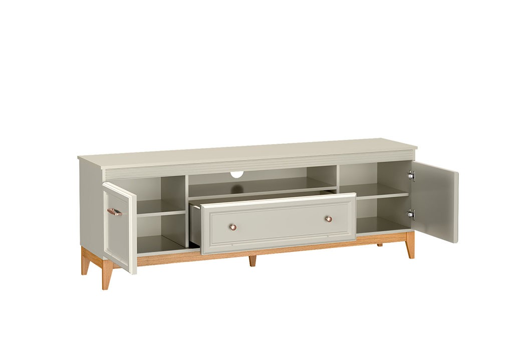 Wzbogać swój salon o styl i wygodę dzięki modelowi Windsor-9 – powiększonej wersji cenionej szafki Windsor-8. To idealny wybór dla osób poszukujących efektownego, a jednocześnie pojemnego mebla pod telewizor. Klasyczna forma w odcieniu kaszmiru, połączona z drewnianymi nóżkami i subtelnymi uchwytami, tworzy spójną, elegancką całość, która harmonijnie współgra z aranżacjami nowoczesnymi, skandynawskimi oraz tradycyjnymi.