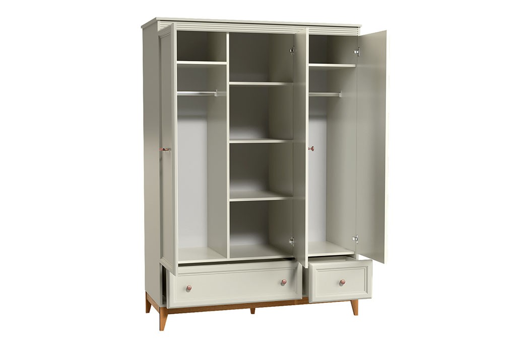 Całość wspiera się na drewnianych nogach, dodających konstrukcji lekkości, charakteru i ułatwiających sprzątanie przestrzeni pod szafą.