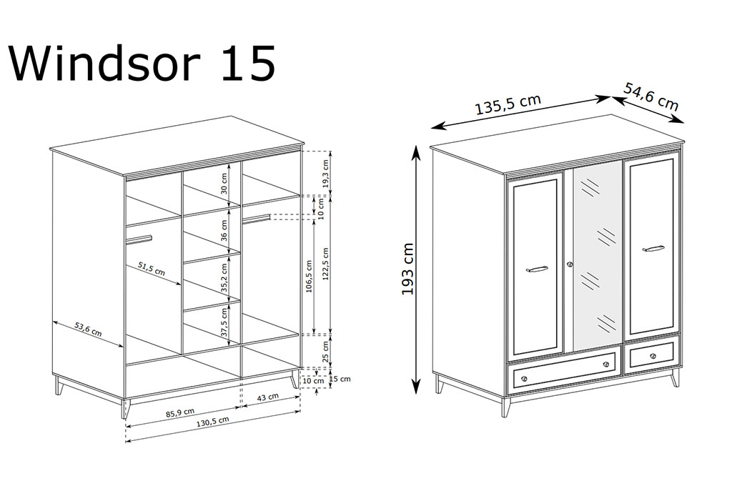 Szafa WINDSOR W-15 to propozycja dla osób, które chcą połączyć praktyczną organizację przestrzeni z eleganckim wyglądem. Trzydrzwiowa konstrukcja łączy klasyczną linię z funkcjonalnym wnętrzem oraz subtelnymi detalami wykończenia.
