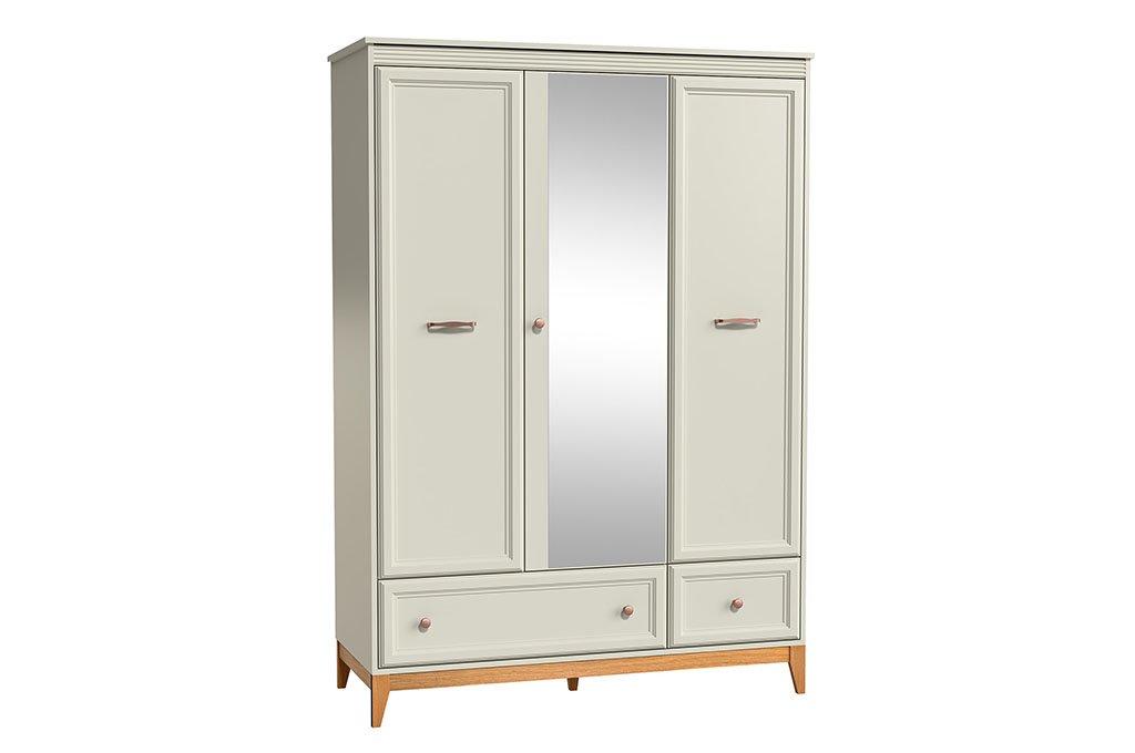 W centralnej części zastosowano lustro, za którym znajdują się trzy obszerne półki umożliwiające wygodne rozmieszczenie złożonych ubrań, dodatków i pościeli. Po obu stronach rozmieszczono części z górną półką oraz drążkiem, dzięki czemu łatwo uporządkować odzież wiszącą.
