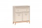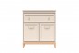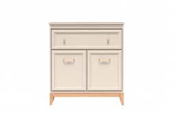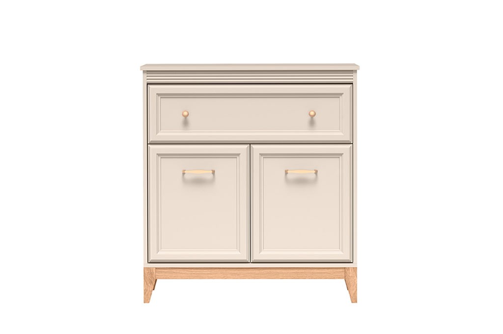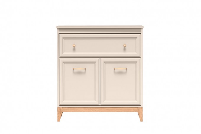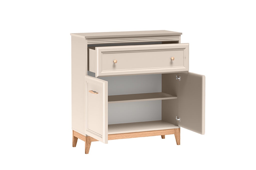 W górnej części komody umieszczono pojemną szufladę wyposażoną w system cichego domyku — świetną na drobne akcesoria, dokumenty lub rzeczy codziennego użytku. Pod nią znajduje się zamykana szafka z praktyczną półką, w której z łatwością pomieścisz buty, torebki czy inne potrzebne przedmioty.