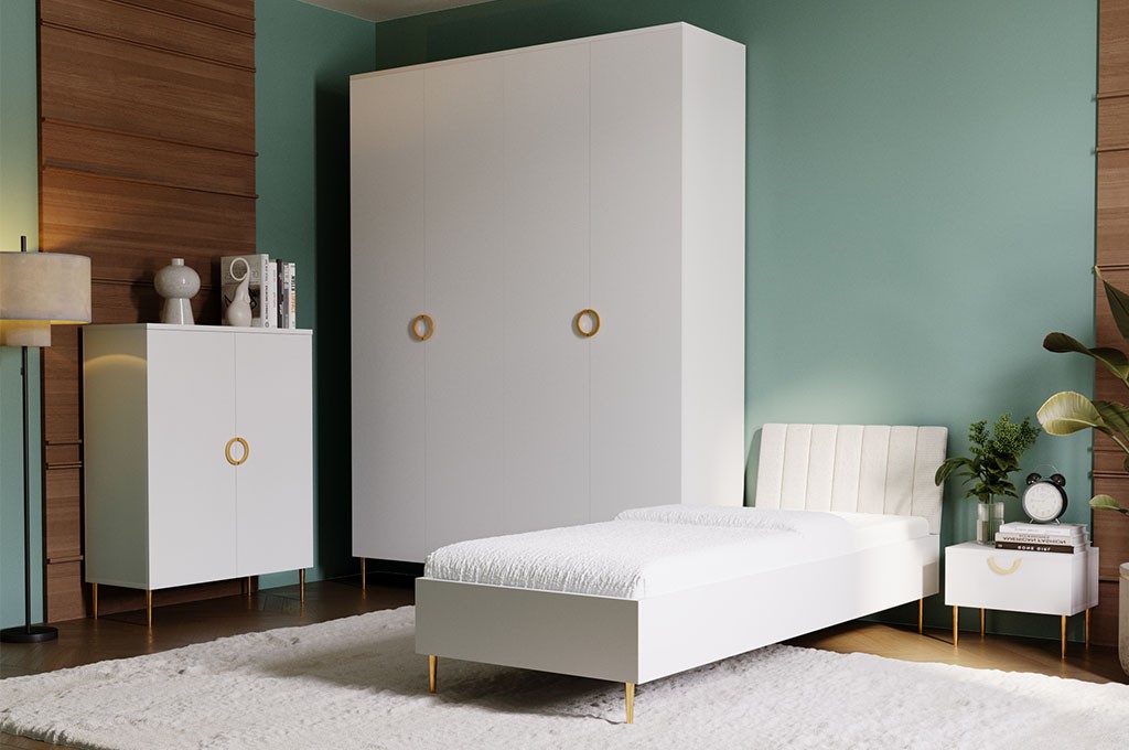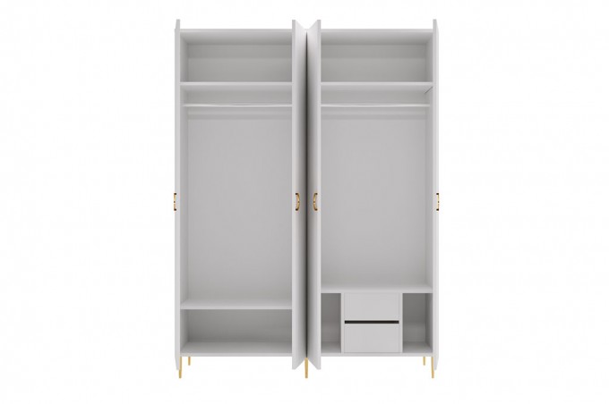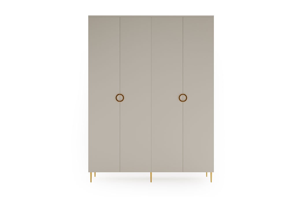 Czterodrzwiowa szafa o szerokości 180 cm to idealne połączenie funkcjonalności i eleganckiego designu, które doskonale sprawdzi się w sypialni, garderobie lub nowoczesnym przedpokoju. Modny kolor kaszmir wprowadza do wnętrza ciepło i subtelną elegancję, a złote metalowe uchwyty oraz nóżki nadają meblowi luksusowego charakteru, typowego dla stylu glamour.