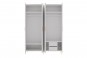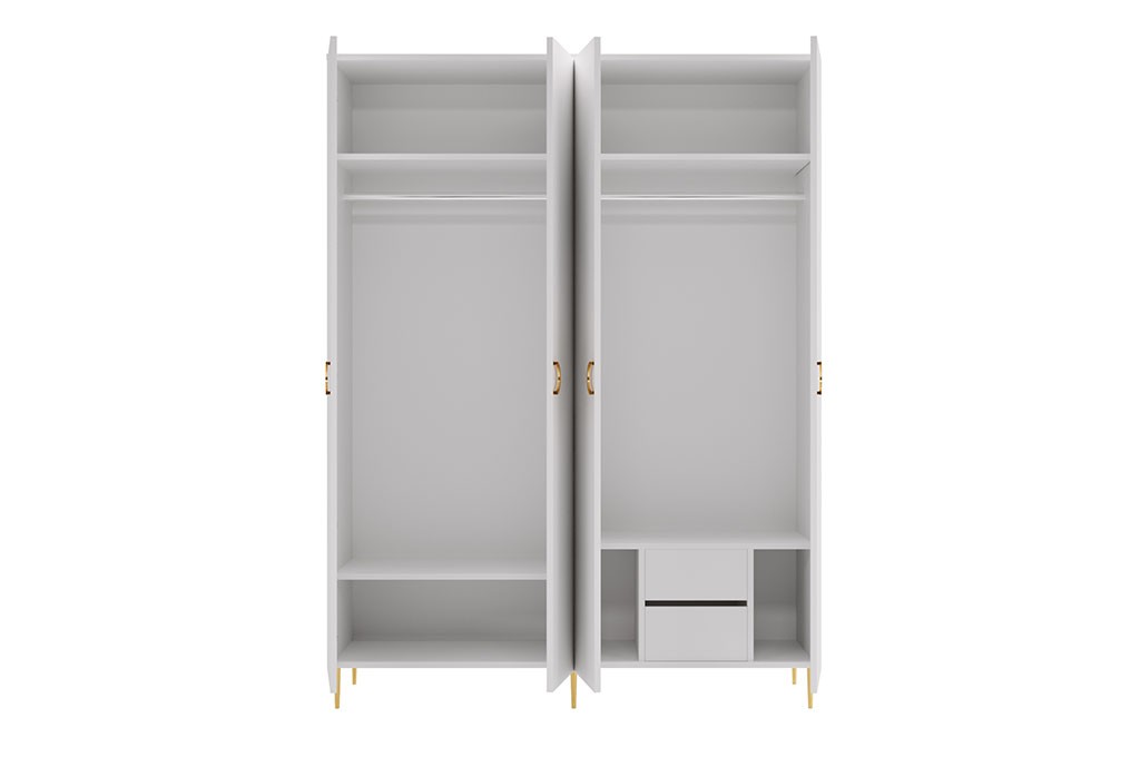 Starannie zaprojektowane wnętrze zapewnia wygodne i uporządkowane przechowywanie odzieży. Po obu stronach szafy znajdują się praktyczne strefy z półkami i drążkami – każda z nich została wyposażona w górną półkę, drążek na wieszaki oraz dolną półkę, co pozwala na funkcjonalne zagospodarowanie przestrzeni. Dodatkowym atutem są dwie pojemne szuflady umieszczone po prawej stronie, idealne do przechowywania bielizny, akcesoriów i drobnych elementów garderoby.