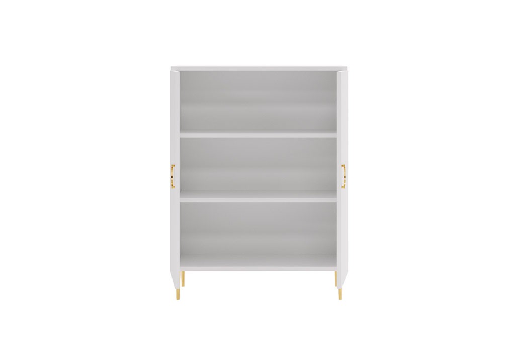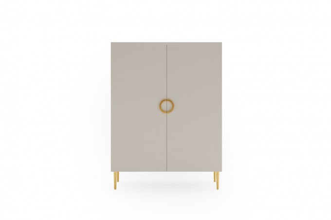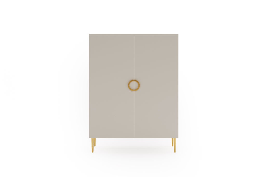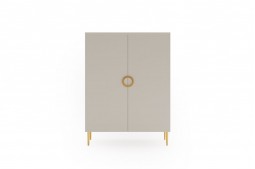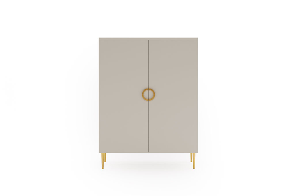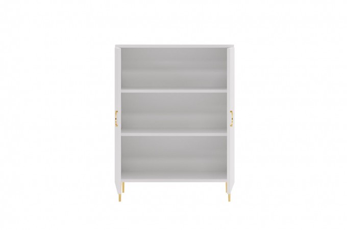 Złote metalowe nóżki i uchwyty nadają BELUNA luksusowego charakteru w stylu glamour, podkreślając elegancki wystrój wnętrza. Mebel wyposażono w dwa fronty uchylne, za którymi znajdują się dwie pojemne półki – idealne do przechowywania dokumentów, tekstyliów czy drobnych akcesoriów.