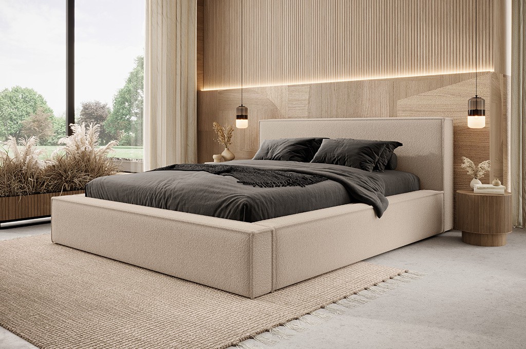 Łóżko zostało tapicerowane tkaniną premium Abriamo typu Baranek, która wyróżnia się wyjątkowo miękką i przyjemną w dotyku strukturą oraz modnym efektem „baranka”, nadającym wnętrzu ciepła i przytulności. Tkanina charakteryzuje się wysoką odpornością na ścieranie oraz łatwością w pielęgnacji, dzięki czemu łóżko zachowuje swój estetyczny wygląd przez długi czas. Proste kształty mebla w połączeniu z wysokiej jakości materiałami sprawiają, że łóżko LATON to ponadczasowa bryła, która łączy estetykę z funkcjonalnością i doskonale sprawdzi się jako centralny punkt każdej nowoczesnej sypialni.