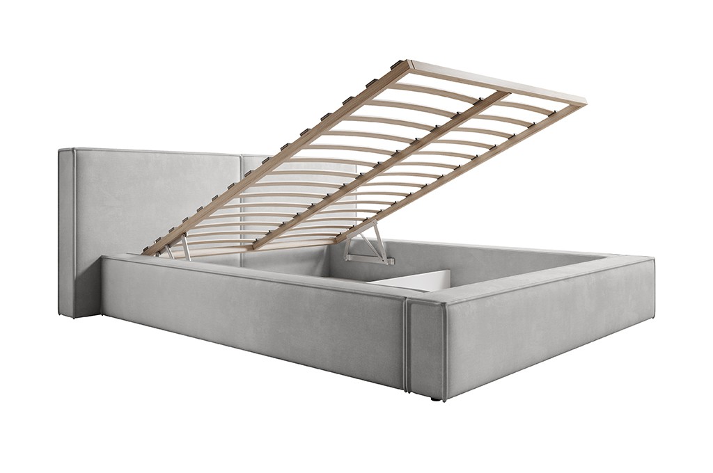 Metalowy stelaż z siłownikami gazowymi wyróżnia się wysoką trwałością i stabilnością, a dzięki mechanizmowi wspomagającemu podnoszenie umożliwia lekkie i wygodne otwieranie pojemnika na pościel, znacząco podnosząc komfort codziennego użytkowania łóżka.