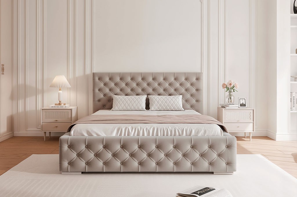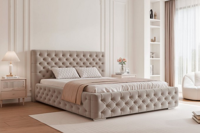 Łóżko tapicerowane jest wysokiej jakości welurową tkaniną Magic Velvet, która zachwyca miękką, aksamitną strukturą oraz subtelnym połyskiem, nadając meblowi elegancki i luksusowy wygląd. Tkanina ta cechuje się wysoką odpornością na ścieranie, łatwością w pielęgnacji oraz przyjemnością w dotyku, dzięki czemu łóżko przez długi czas zachowuje estetyczny wygląd. Pikowane guziki w kolorze materiału, zastosowane na całej powierzchni łóżka, tworzą spójną i harmonijną całość, podkreślając wyjątkowy charakter modelu CARMELO.