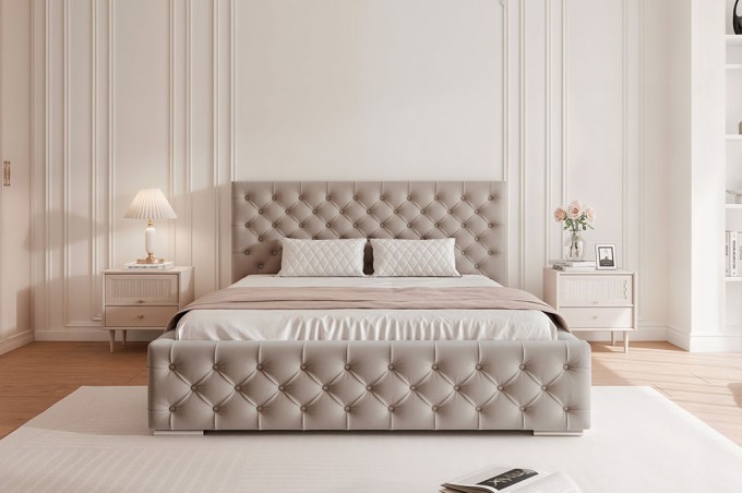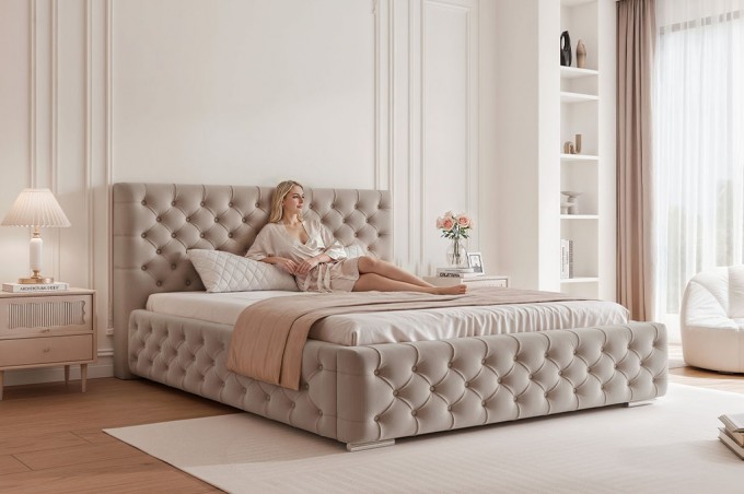 Łóżko tapicerowane CARMELO to wyjątkowa propozycja dla miłośników elegancji i ponadczasowego stylu, inspirowanego klasycznym wzornictwem Chesterfield. Efektowne, wysokie wezgłowie o wysokości 110 cm zostało starannie pikowane guzikami w kolorze tkaniny, tworząc luksusowy i wyrafinowany wygląd, który nadaje sypialni prestiżowego charakteru. Miękka pianka o grubości 5 cm zastosowana w wezgłowiu zapewnia nie tylko elegancki wygląd, ale również wysoki komfort podczas codziennego relaksu, czytania czy odpoczynku.