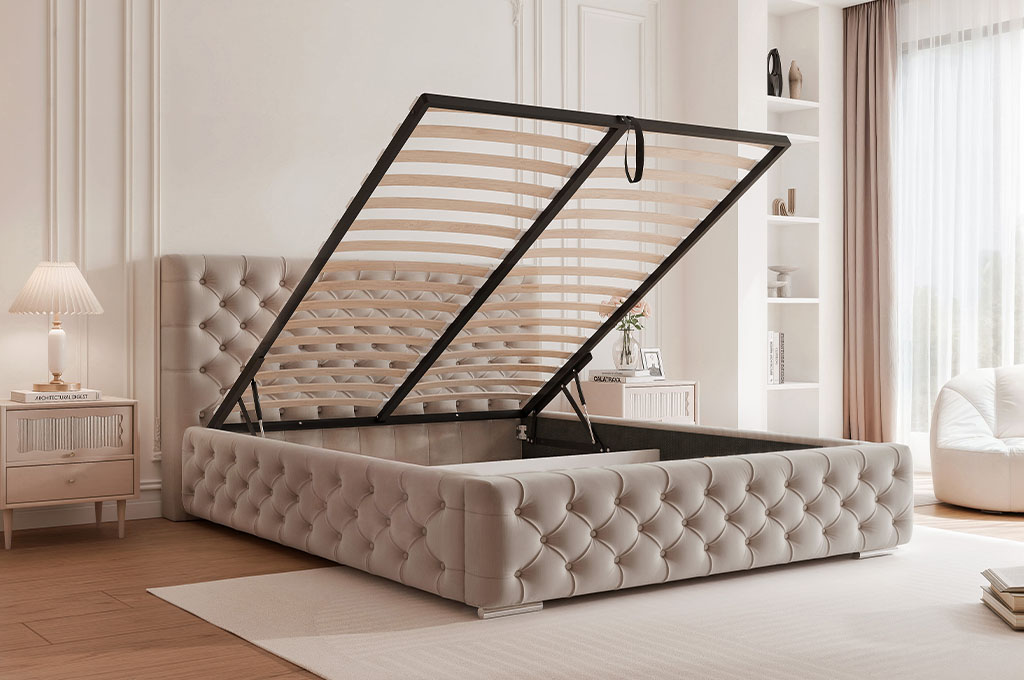 Metalowy stelaż z siłownikami gazowymi wyróżnia się wysoką trwałością i stabilnością, a dzięki mechanizmowi wspomagającemu podnoszenie umożliwia lekkie i wygodne otwieranie pojemnika na pościel, znacząco podnosząc komfort codziennego użytkowania łóżka.