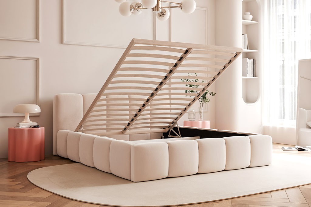 Metalowy stelaż z siłownikami gazowymi wyróżnia się wysoką trwałością i stabilnością, a dzięki mechanizmowi wspomagającemu podnoszenie umożliwia lekkie i wygodne otwieranie pojemnika na pościel, znacząco podnosząc komfort codziennego użytkowania łóżka.