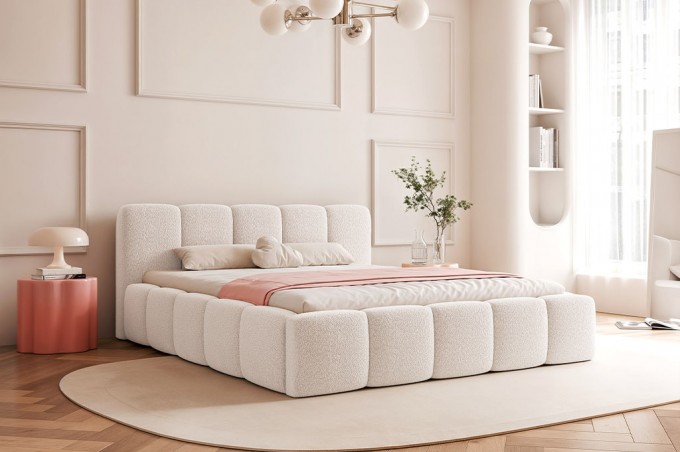 Nowoczesne łóżko tapicerowane z pojemnikiem na pościel w tkaninie boucle 180x200 CLOUDY LOW