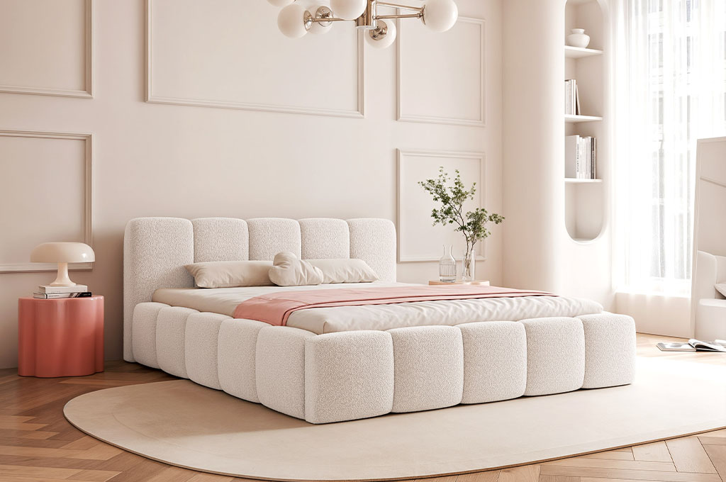 Nowoczesne łóżko tapicerowane z pojemnikiem na pościel w tkaninie boucle 200x200 CLOUDY LOW