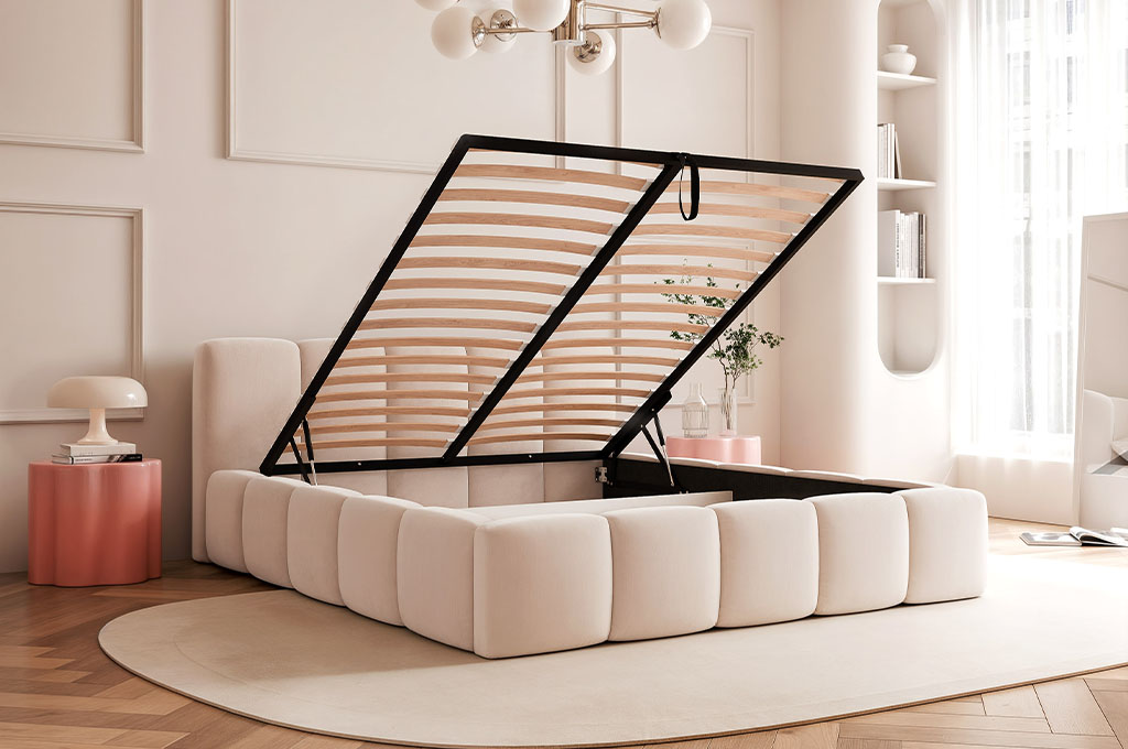 Metalowy stelaż z siłownikami gazowymi wyróżnia się wysoką trwałością i stabilnością, a dzięki mechanizmowi wspomagającemu podnoszenie umożliwia lekkie i wygodne otwieranie pojemnika na pościel, znacząco podnosząc komfort codziennego użytkowania łóżka.