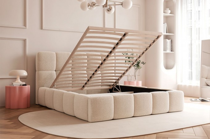 Metalowy stelaż z siłownikami gazowymi wyróżnia się wysoką trwałością i stabilnością, a dzięki mechanizmowi wspomagającemu podnoszenie umożliwia lekkie i wygodne otwieranie pojemnika na pościel, znacząco podnosząc komfort codziennego użytkowania łóżka.