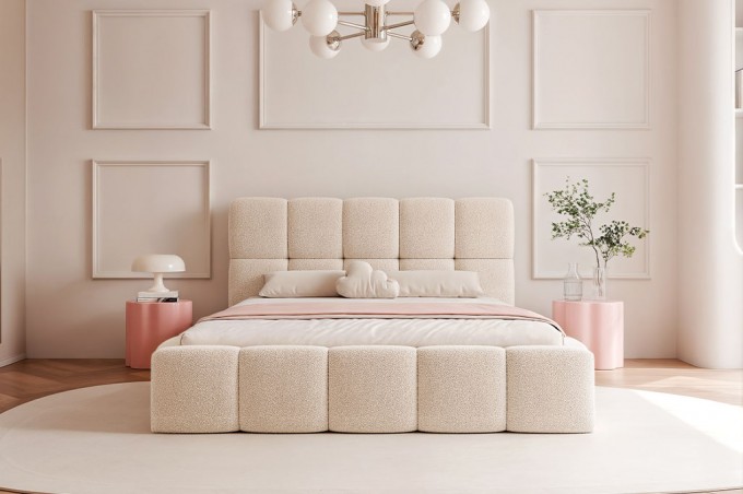 Nowoczesne łóżko tapicerowane z pojemnikiem na pościel w tkaninie ABRIAMO 180x200 CLOUDY boucle
