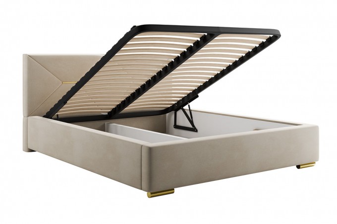 Łóżko standardowo wyposażone zostało w metalowy stelaż z siłownikami gazowymi 1000N oraz duży pojemnik na pościel pod całą powierzchnią spania. Korpus stoi na metalowych nóżkach. Szkielet łóżka został stworzony z drewna oraz płyty meblowej.