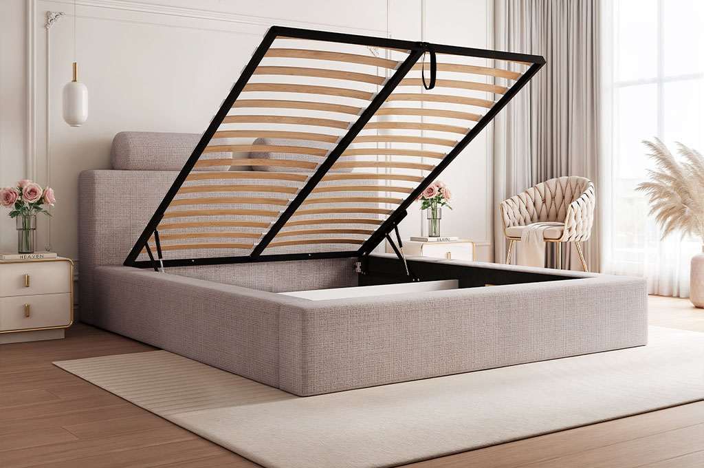 Metalowy stelaż z siłownikami gazowymi wyróżnia się wysoką trwałością i stabilnością, a dzięki mechanizmowi wspomagającemu podnoszenie umożliwia lekkie i wygodne otwieranie pojemnika na pościel, znacząco podnosząc komfort codziennego użytkowania łóżka.