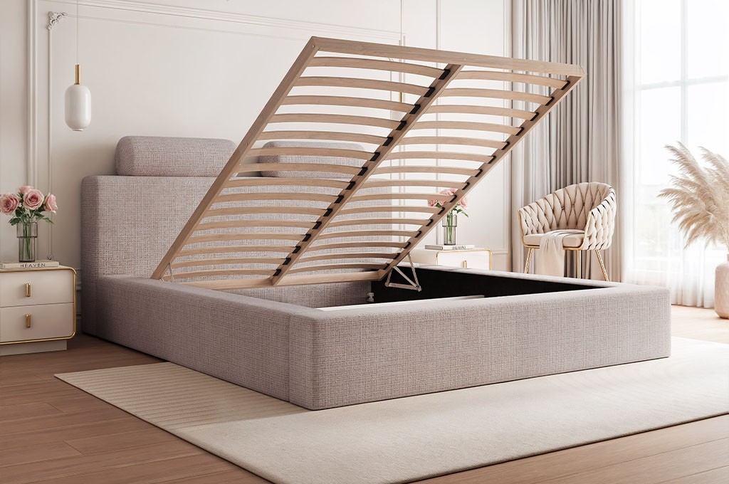 Metalowy stelaż z siłownikami gazowymi wyróżnia się wysoką trwałością i stabilnością, a dzięki mechanizmowi wspomagającemu podnoszenie umożliwia lekkie i wygodne otwieranie pojemnika na pościel, znacząco podnosząc komfort codziennego użytkowania łóżka.