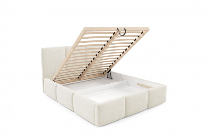 Model VELLURA oferuje również praktyczne rozwiązania ułatwiające codzienne użytkowanie. Pod materacem znajduje się pojemny schowek na pościel, który doskonale sprawdzi się do przechowywania kołder, poduszek czy dodatkowych tekstyliów. Otwieranie pojemnika jest lekkie i wygodne dzięki zastosowaniu automatu na sprężynach, który wspomaga podnoszenie stelaża.