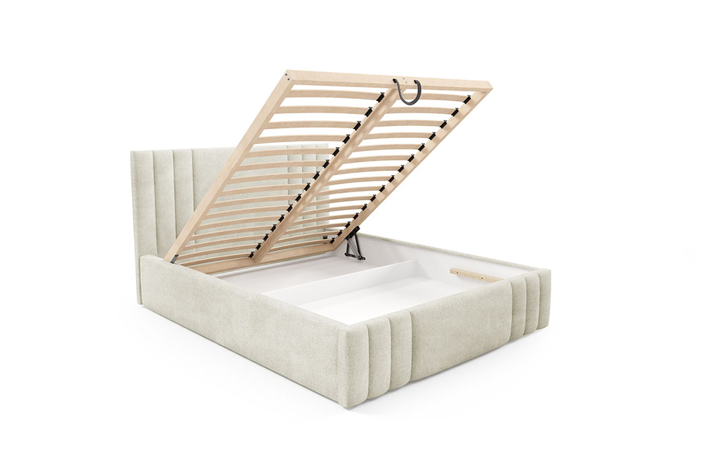 Model ROVENA oferuje również praktyczny pojemnik na pościel, który pozwala wygodnie przechowywać kołdry, poduszki lub inne tekstylia. Dostęp do schowka jest niezwykle prosty dzięki zastosowaniu automatu na sprężynach, który ułatwia podnoszenie stelaża i sprawia, że otwieranie pojemnika jest lekkie oraz wygodne.
