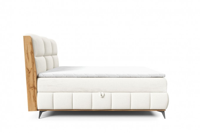 Centralnym elementem łóżka jest eleganckie wezgłowie, częściowo tapicerowane tkaniną i ozdobione starannymi przeszyciami, które podkreślają estetykę i nowoczesny charakter mebla. Po bokach wezgłowia znajdują się dekoracyjne elementy z płyty laminowanej w kolorze dąb lancelot, które harmonijnie komponują się z naturalnym wykończeniem skrzyni. Całość tworzy spójną i ponadczasową aranżację sypialni.