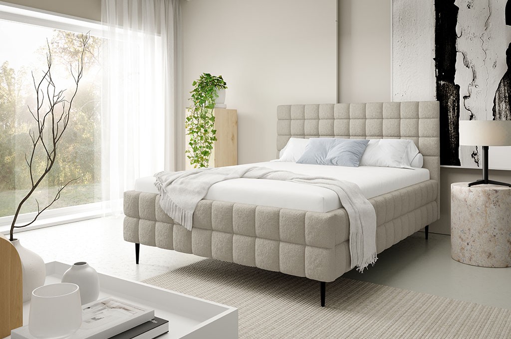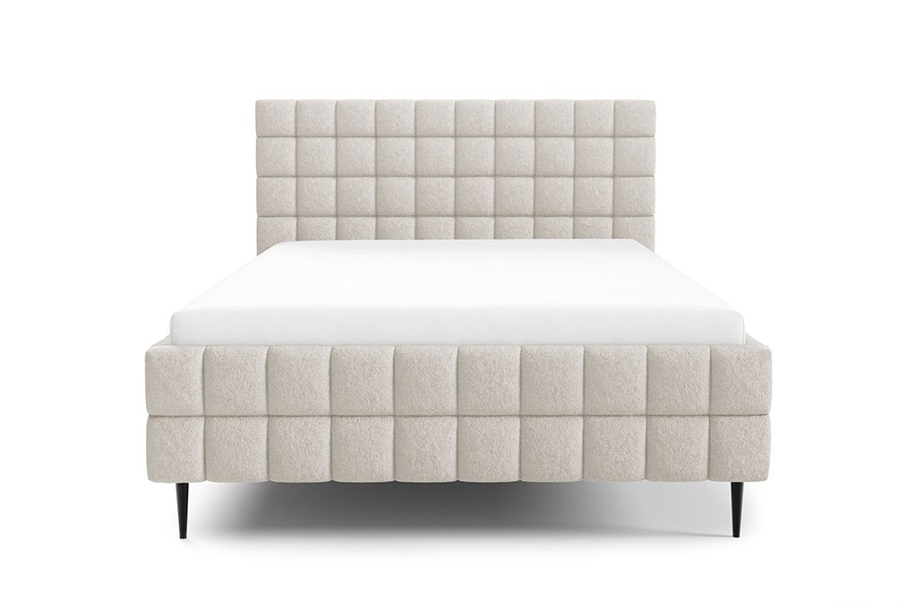 Tapicerowana konstrukcja łóżka została ozdobiona efektownymi przeszyciami w kształcie kwadratu, które nadają bryle wyrazistego charakteru i podkreślają jej nowoczesny styl. Subtelne detale sprawiają, że AURELIA przyciąga wzrok i staje się centralnym punktem sypialni, wprowadzając do niej atmosferę elegancji oraz przytulności.